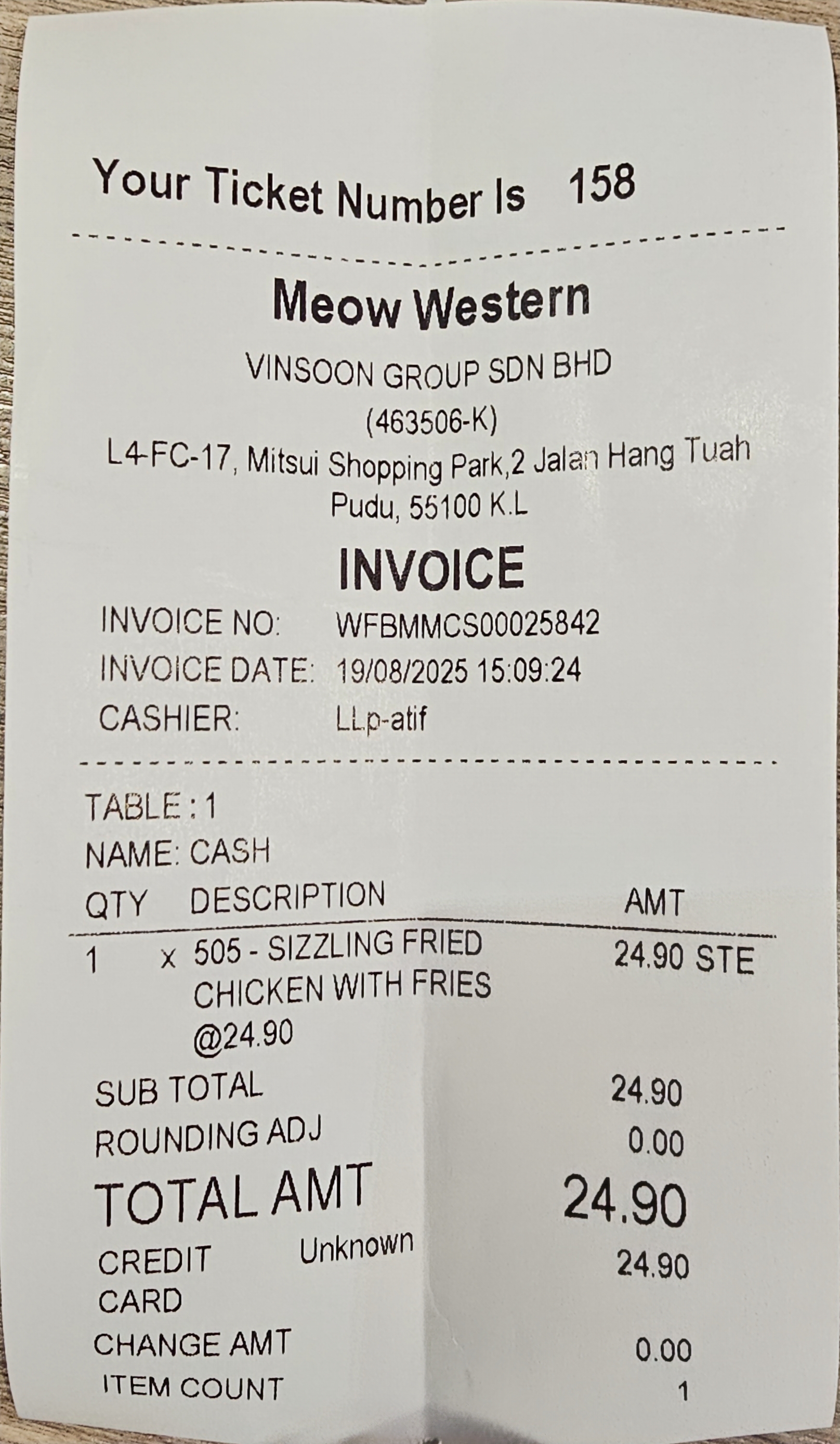 Meow Western [미아오 웨스턴]이란 Garden dinnig 푸드코트 내 음식점에서 Sizzle fried chicken chop을 주문하였습니다.